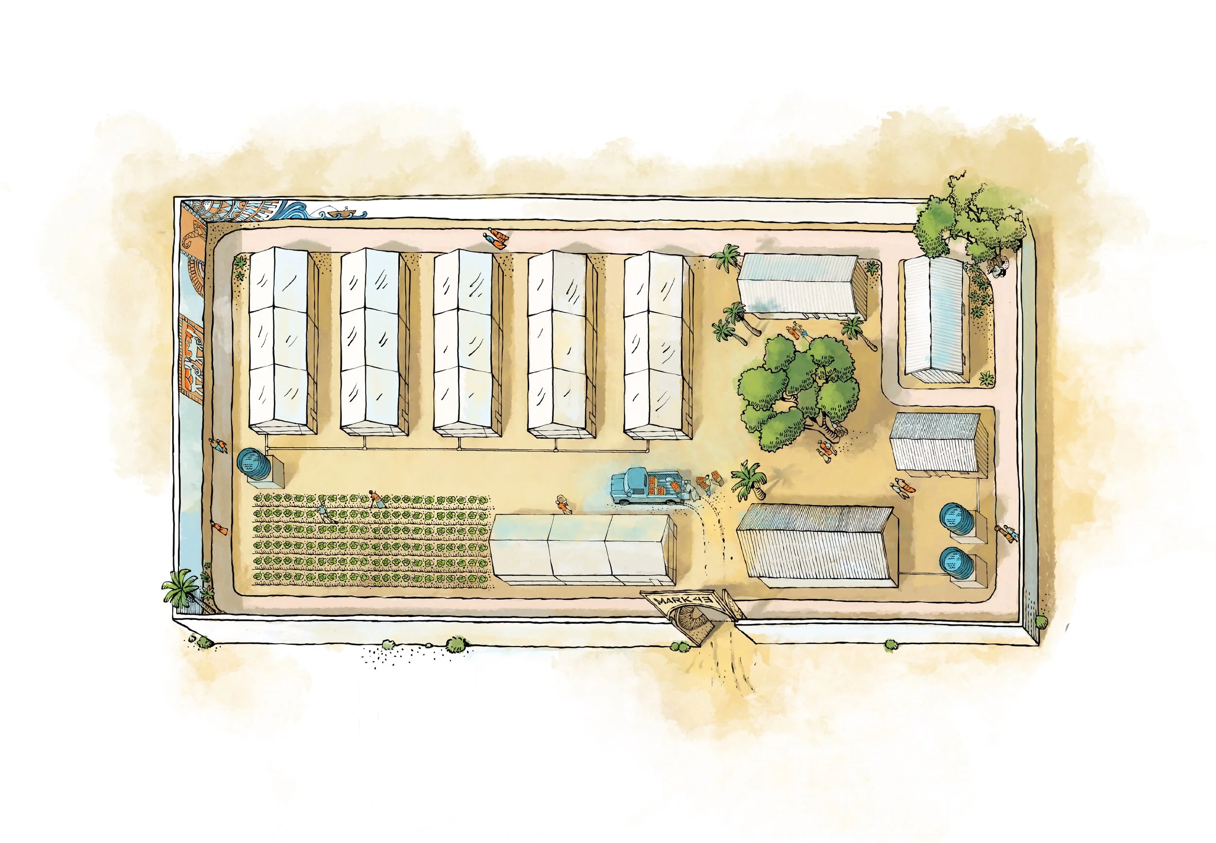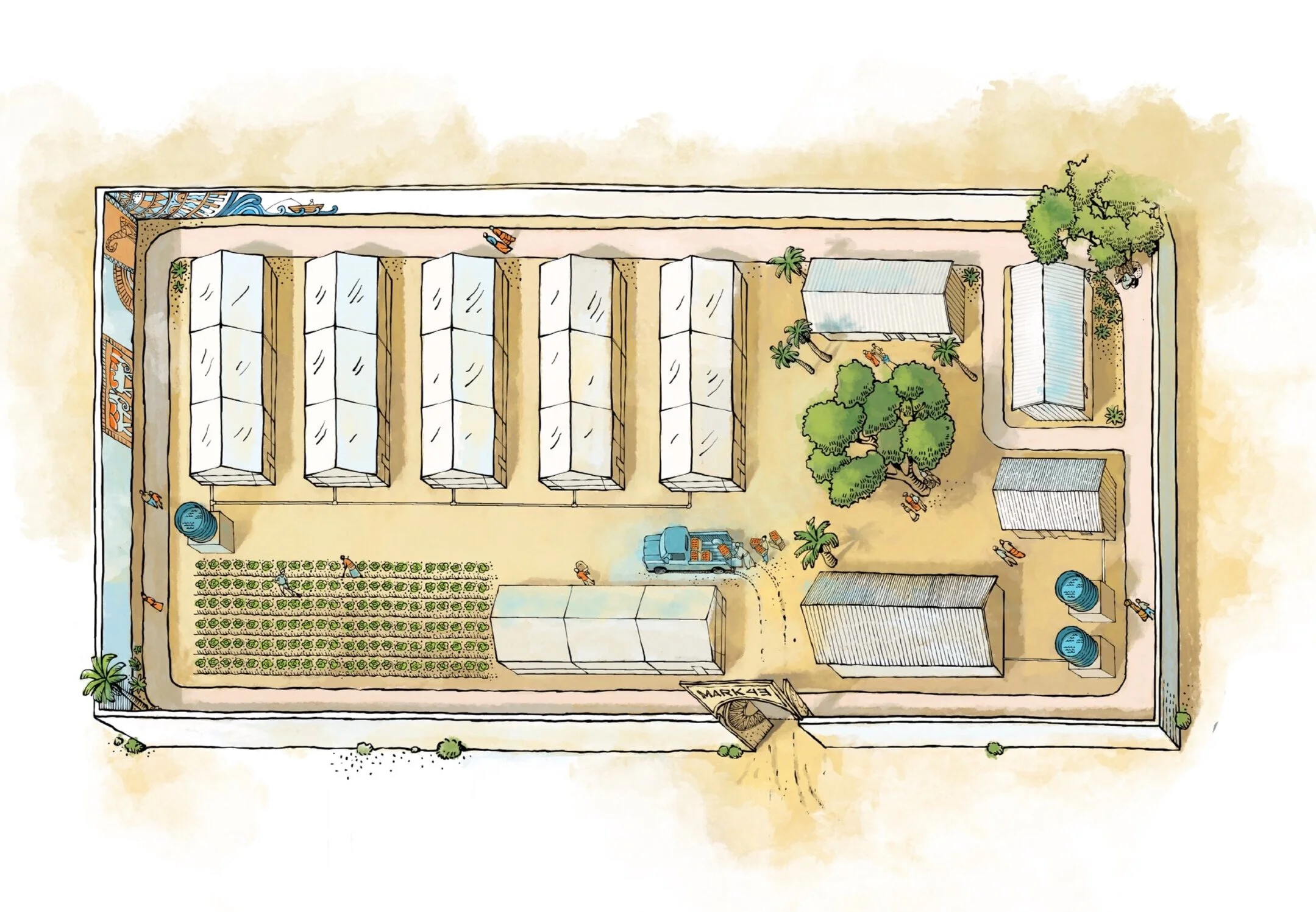 Artistic rendering of future greenhouse farming enterprise in Nigeria. All illustrations by Tom Post.